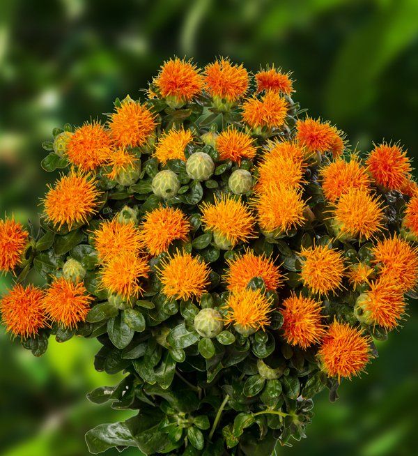 ButtonCarthamus Tinctorius is een markante verschijning, met vurige oranje distelachtige bloemen en donkergroen blad.