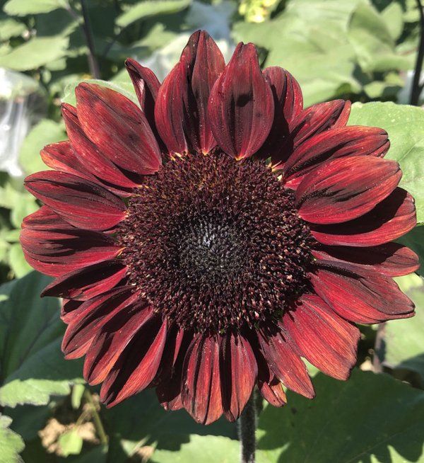 ButtonHelianthus Procut® Red heeft diep bordeaux-kleurige, stuifmeelvrije bloemen, met een donker hart.